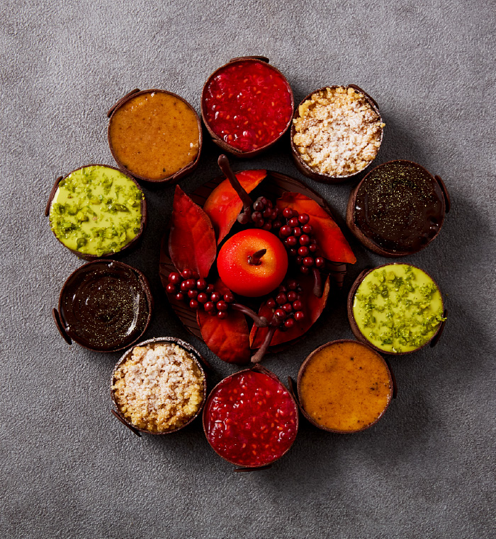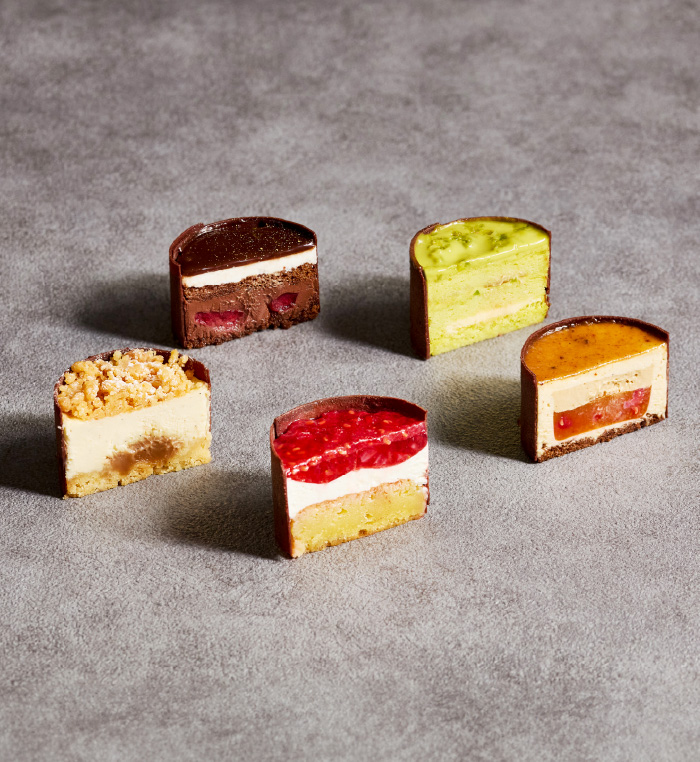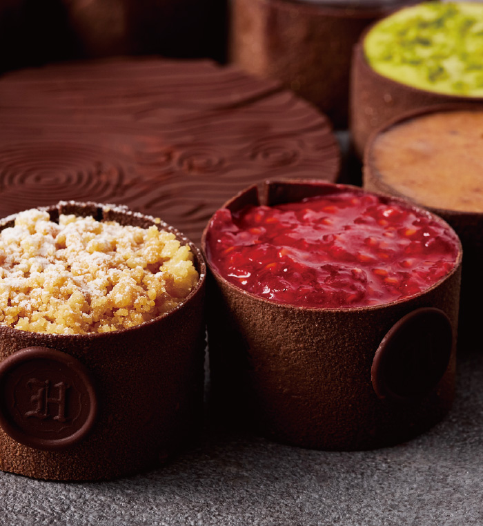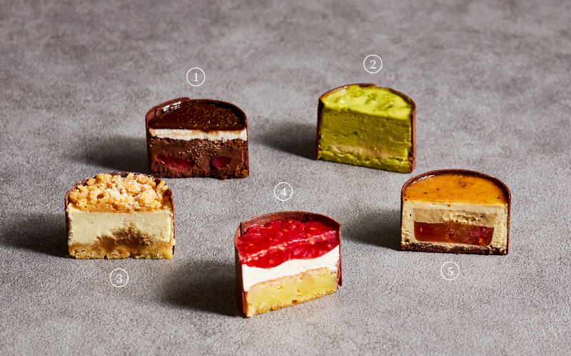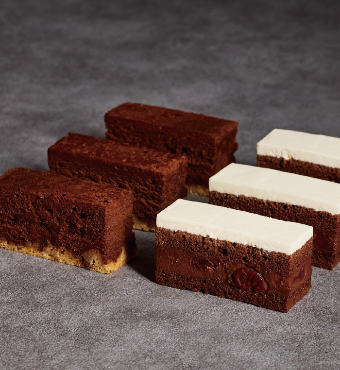 チョコレートで仕上げた美しい本の中には、ベリーのジュレを合わせたピスタチオ&マスカルポーネ、キャラメル&ショコラの2種の異なる味わいが詰まっています。シェフパティシエ茂木による、毎年ご好評の逸品です。