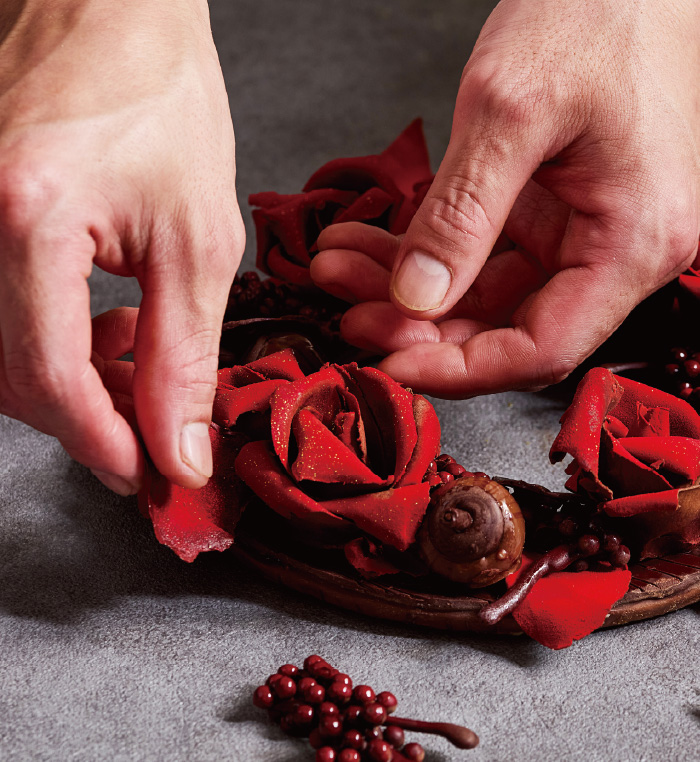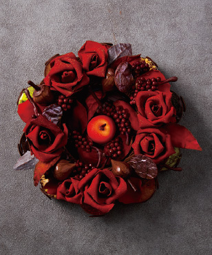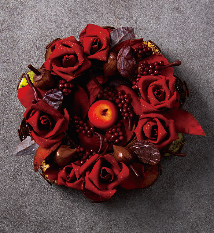 冬の幻想的な夜に明りを灯す美しいチョコレートのクリスマスリース。ホテル伝統のアーモンドサブレ「スタンゲン」をリース台に、バラ・りんご・赤すぐり・どんぐりなどの華やかなチョコレート細工が彩ります。リースの下にはキャンドルに見立てた5種の異なる味わいのケーキが10個隠れています。