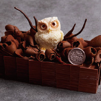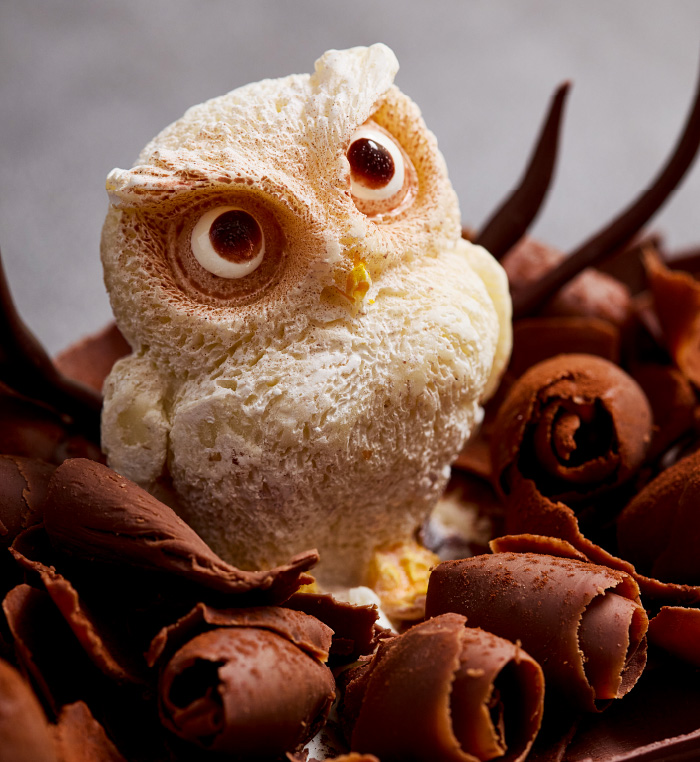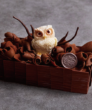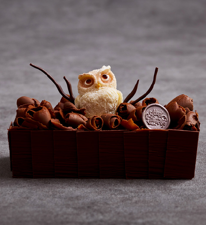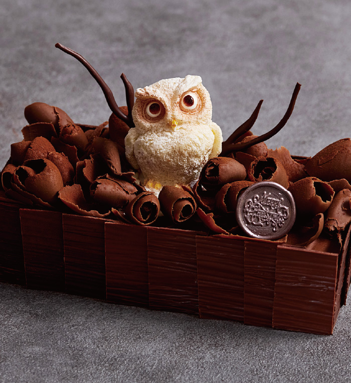 冬の深い森の静寂な夜を見守るふくろうをモチーフにした進化型ブッシュ・ド・ノエル。パティシエが味わいと香りにこだわったハイカカオチョコレートをふんだんに使用し、クリスマスにふさわしい味わいを追求しました。木肌を模したチョコレートの中には、オレンジピールのほろ苦さがアクセントになった濃厚なテリーヌショコラと、キルシュをきかせたフォレノワールの2つの味が隠れています。上面には、枝葉の茂みに見立てたジャンドゥージャに真っ白なフクロウが静かに佇む姿が表現されています。