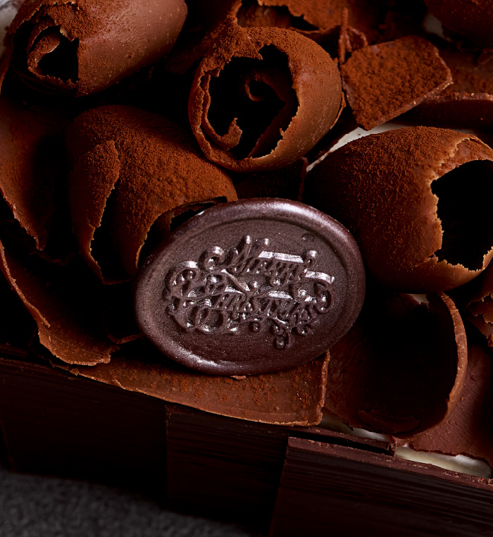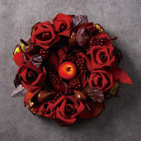 クリスマスリースやキャンドルをモチーフとした、繊細なチョコレート細工が特徴のクリスマスケーキ。リースは全てチョコレートでできており、バラ、りんご、赤すぐり、どんぐり、木の葉などの装飾も、すべて美味しくお召し上がりいただけます。リース台にはホテル伝統のアーモンドサブレ“スタンゲン”を使用しており、その下にはチョコレートフィルムに包まれた5つの異なる味わいのミニケーキが隠されています。