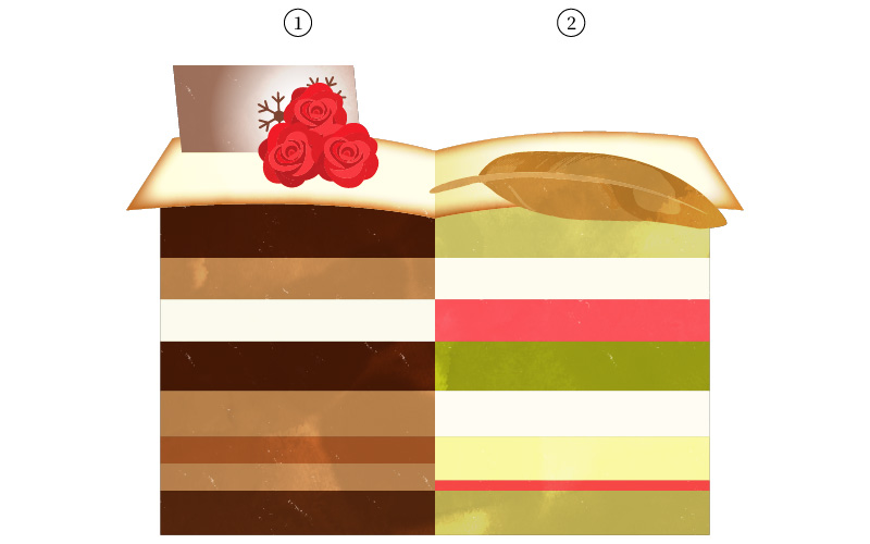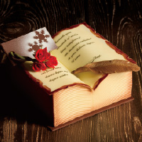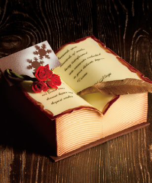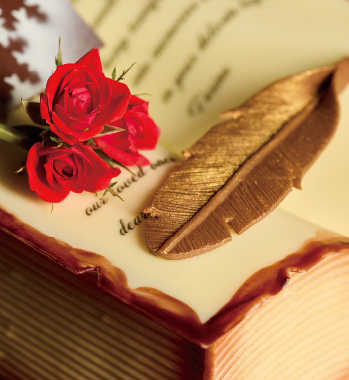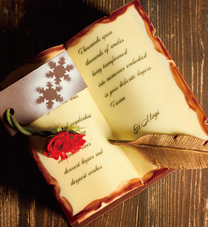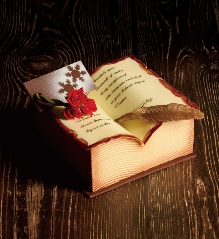 チョコレートで仕上げた美しい本の中には、果実の香りが心地よいピスタチオ&マスカルポーネと、ほんのりビターなキャラメル&ショコラの2種の異なる味わいが詰まっています。見開いた左右のページをはじめ羽根ペンやしおりはすべてチョコレート細工でつくられた逸品です。