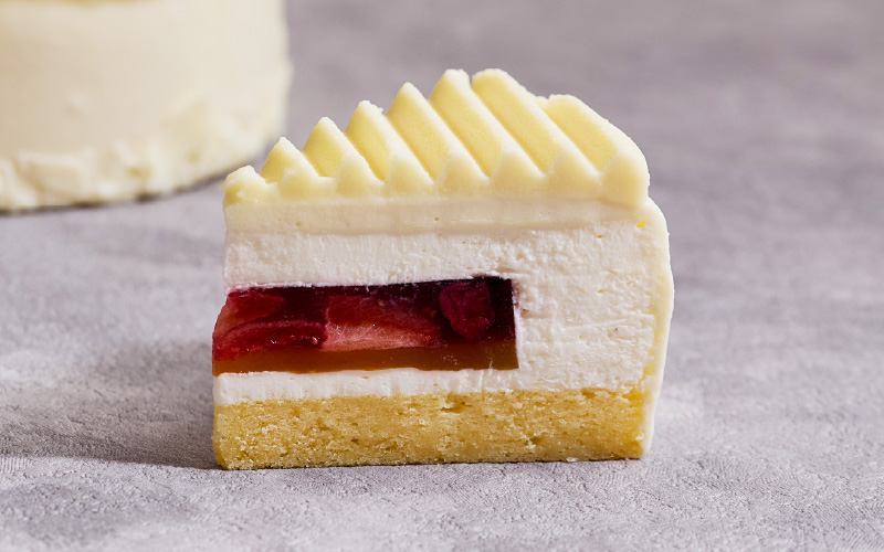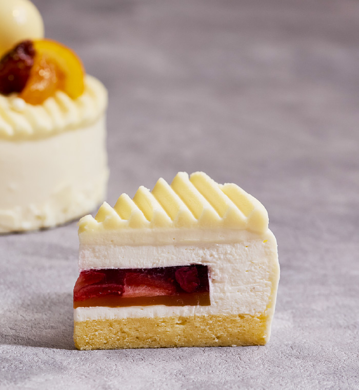 画家マティスのロザリオ礼拝堂からインスピレーションを得て、光と鮮やかな色を意識し、クリスマスの雰囲気を優しく包み込むようなケーキに仕上げました。真っ白な佇まいのケーキにチョコレートで作った白いオーナメントをあしらい、アクセントカラーに赤やオレンジを。ホワイトチョコレートのスポンジに、オレンジとアプリコットのジュレと、いちごとサワーチェリーのジュレを重ね、優しい味わいのチーズムースで包んでいます。
