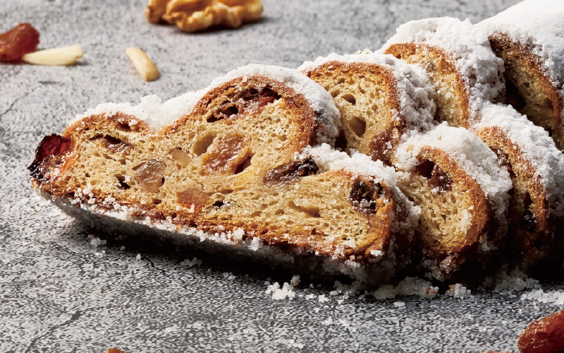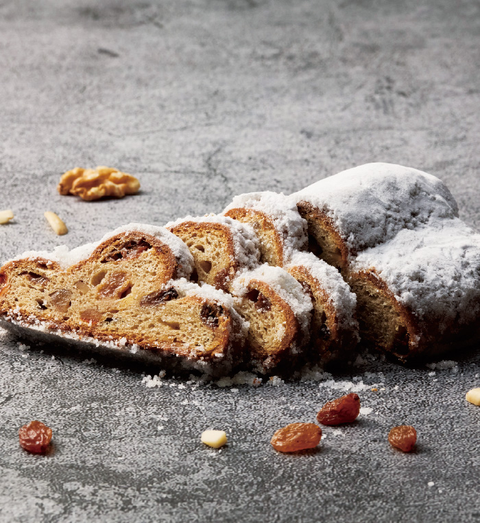 たっぷりとバターを使用したしっとりとした生地に、ラム酒に漬けたドライフルーツやナッツが詰め込まれています。京王プラザホテル初代シェフから受け継がれる、ドイツ生まれのクリスマス伝統菓子です。