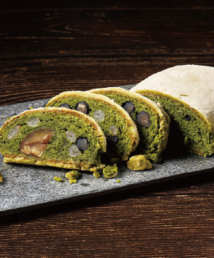 和三盆をまとった濃厚な抹茶生地に、和栗の甘露煮、丹波産黒豆、手亡豆(てぼうまめ)などの和素材を組み合わせた逸品。通常のシュトーレンに比べ約3倍のマジパンを使用し(※当社比)、より一層のしっとり感と上質な口溶けを追求しました。和三盆の上品な甘さの後に感じる抹茶の余韻を、ほくほくとした手亡豆や黒豆の食感と共にお楽しみください。