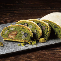 マジパンを贅沢に使った濃厚な抹茶生地に、和栗の甘露煮、丹波産黒豆、手亡豆(てぼうまめ)とこだわり抜いた和素材を組み合せた逸品です。
