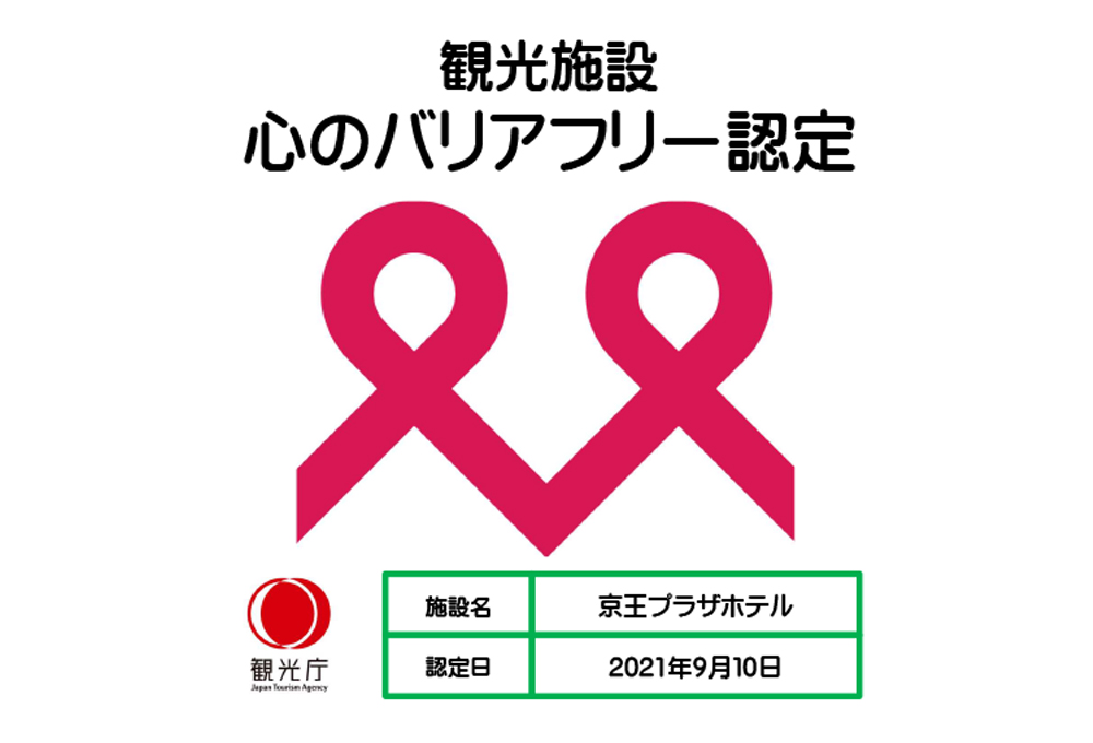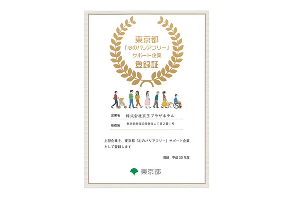 東京都が、高齢の人や障害のある人などに配慮した施設整備やサービス提供など、「心のバリアフリー」に対して優れた取り組みを行う企業等を認定する「『心のバリアフリー』サポート企業」 として京王プラザホテルが登録されました。今後もお客さまの心に寄り添うおもてなしで皆様をお迎えしてまいります。
