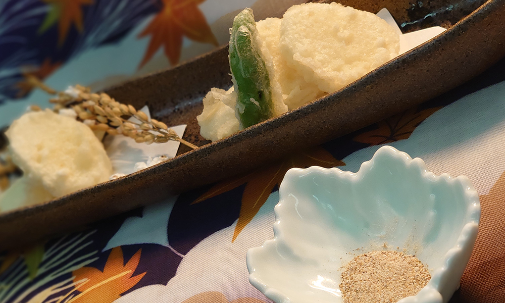和食<かがり>では、調理過程で発生する「唐津自然薯」の皮を無駄なく活かし、塩と混ぜ合わせ、大地の恵みの香り漂う万能塩に生まれ変わらせています。この塩は自然薯の天麩羅とともにお楽しみいただけます。
