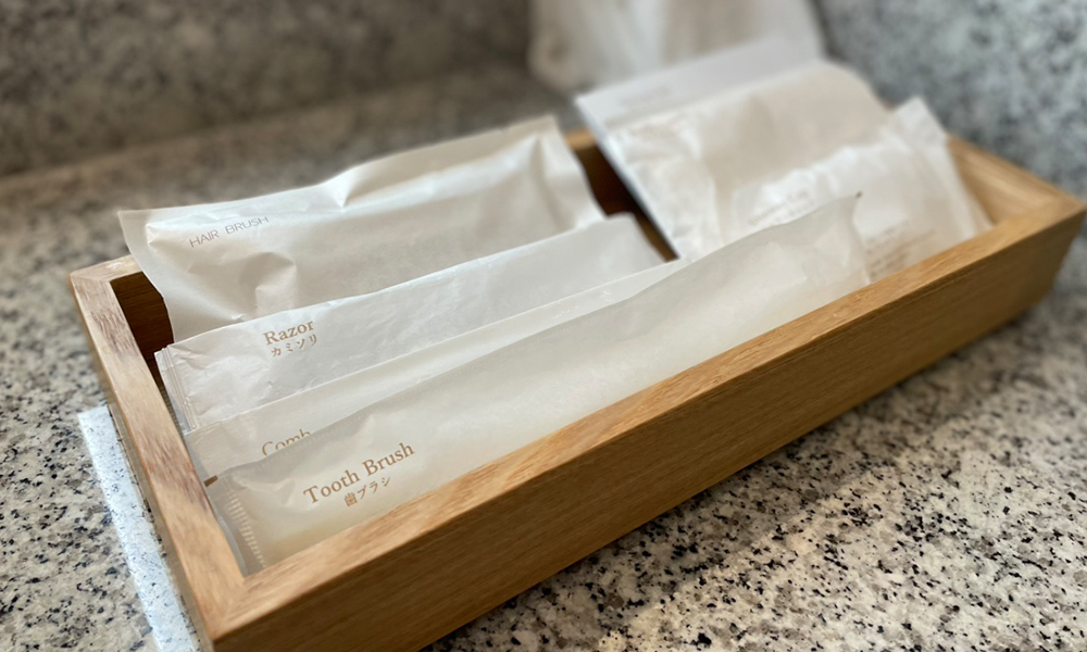 歯ブラシ、ヘアブラシ、カミソリ、シャワーキャップなどのバスアメニティを、環境に配慮した素材に変更し、包装をプラスチック製から紙ベースの包材に切り替えました。さらに、本館のスタンダードルームではシャンプー、コンディショナー、シャワージェルを個装のミニボトルから詰め替え式のポンプボトルに変更し、プラスチックの使用削減に取り組んでいます。