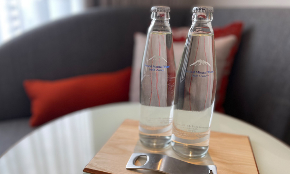 客室に設置しているミネラルウォーターの容器を環境に配慮した素材に変更しました。ガラスびんやアルミ缶に切り替えることで、プラスチック使用量の削減に取り組んでいます。