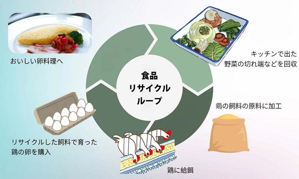 厨房で出た野菜の端材などを、食品循環資源として鶏の飼料にリサイクルし、生産された鶏卵を再びお客さまに提供するリサイクルループを構築しています。朝食のオムレツなど、一部店舗のメニューにこの鶏卵を使用し、食品廃棄物を可燃ごみとして焼却処分するのではなく、資源として循環させています。
