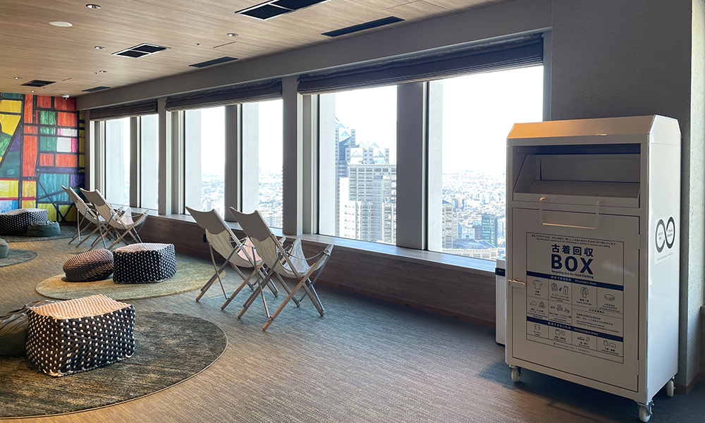 2025年2月より館内に「古着回収ボックス」を設置し、不要な衣類を回収しています。回収した古着は、リサイクル品として転用されるほか、リユース品やアップサイクル品として循環させることで、地球環境の負荷低減に寄与しています。