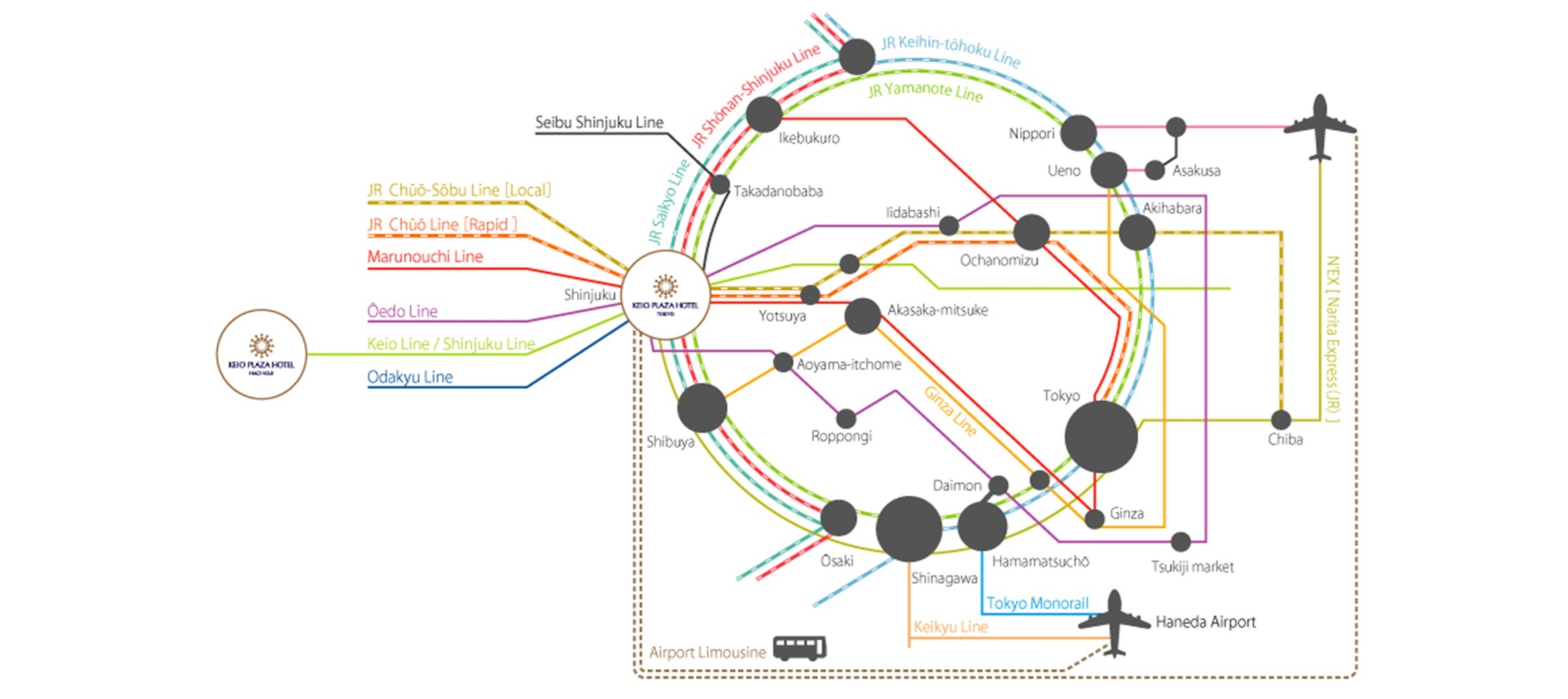 Keio Plaza Hotel operates direct limousine buses to Narita and Haneda airports every day.