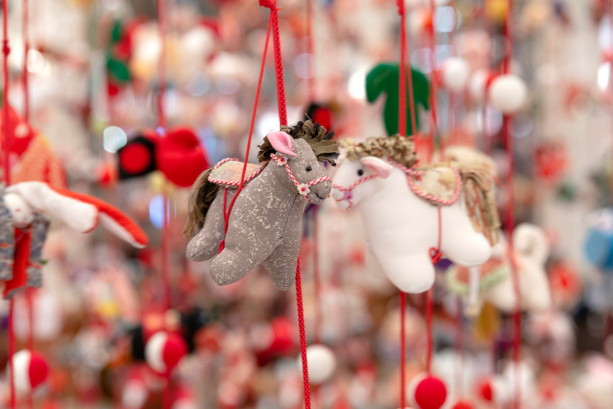 高さ約3メートル、幅約5メートルの空間に、本絹古布(ほんけんこふ)を用いた手縫いのお細工物を約5,000個つるした「つるし飾り」。