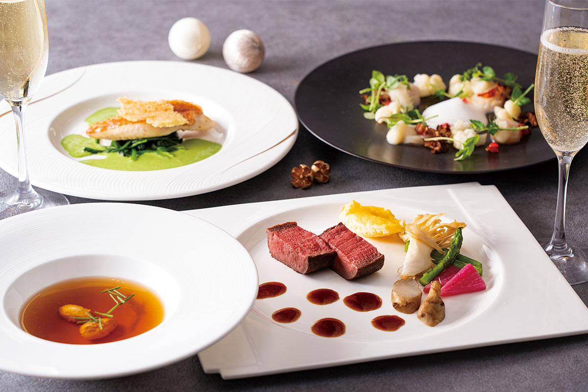 クリスマスリースに見立てた鮮やかな前菜や、じっくりと旨味を凝縮させたホテル特製のスープ、ほうれん草とクリームで味の深みが増した魚料理、メインの牛フィレ肉のロティは重厚な赤ワインソースとともに。