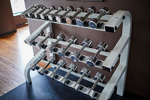 ダンベル、ストレッチエリア、全自動血圧計、体重計