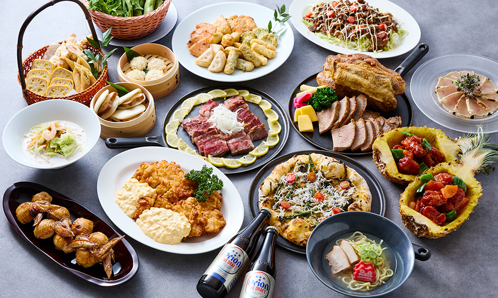 규슈·오키나와 페어 규슈 각지와 오키나와현에서 맛있는 명물 요리를 준비합니다. 라이브 키친에서는 '나가사키 짬뽕'과 '오키나와 소바'를 갓 조리한 상태로 제공합니다. 점심시간의 '시실리안 라이스'와 저녁시간의 '레몬 스테이크' 등 현지 메뉴를 즐겨보시기 바랍니다.