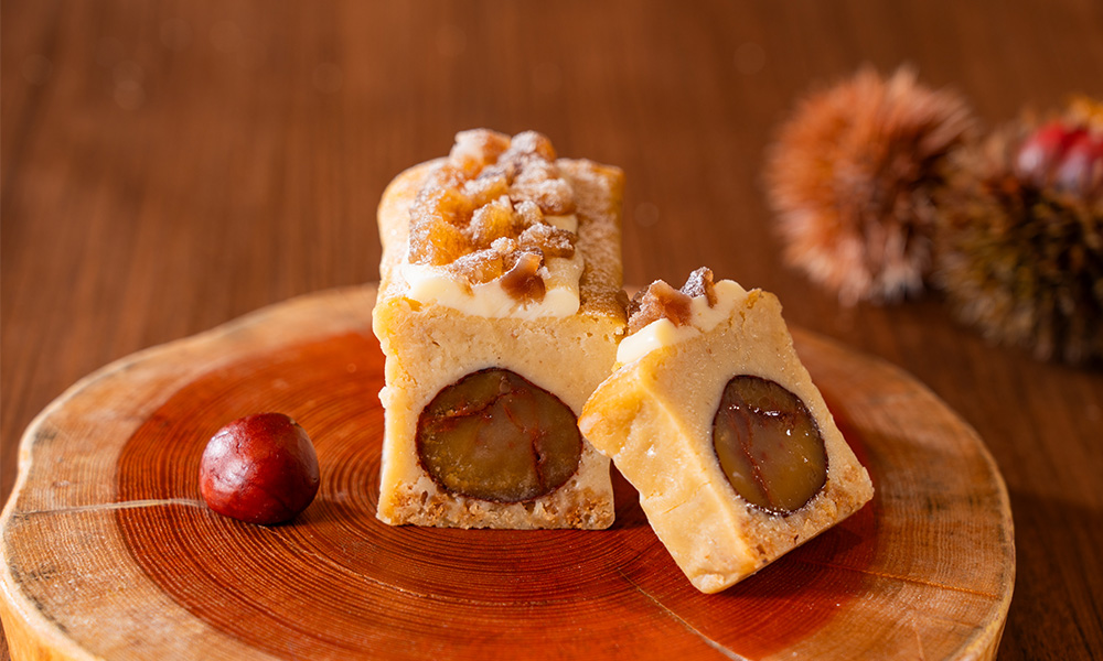 スイーツ:82%のハイカカオチョコレートを使用したビターショコラロールと、渋皮付きの栗をまるごと使用したテリーヌドマロンの2種類をご用意しております。お好きな1品をお選びください。