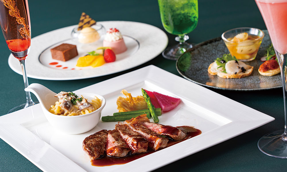 夜になると、しっとりとした雰囲気の中で、洗練されたカクテルや厳選ワイン、ホテルならではの美食を堪能できる