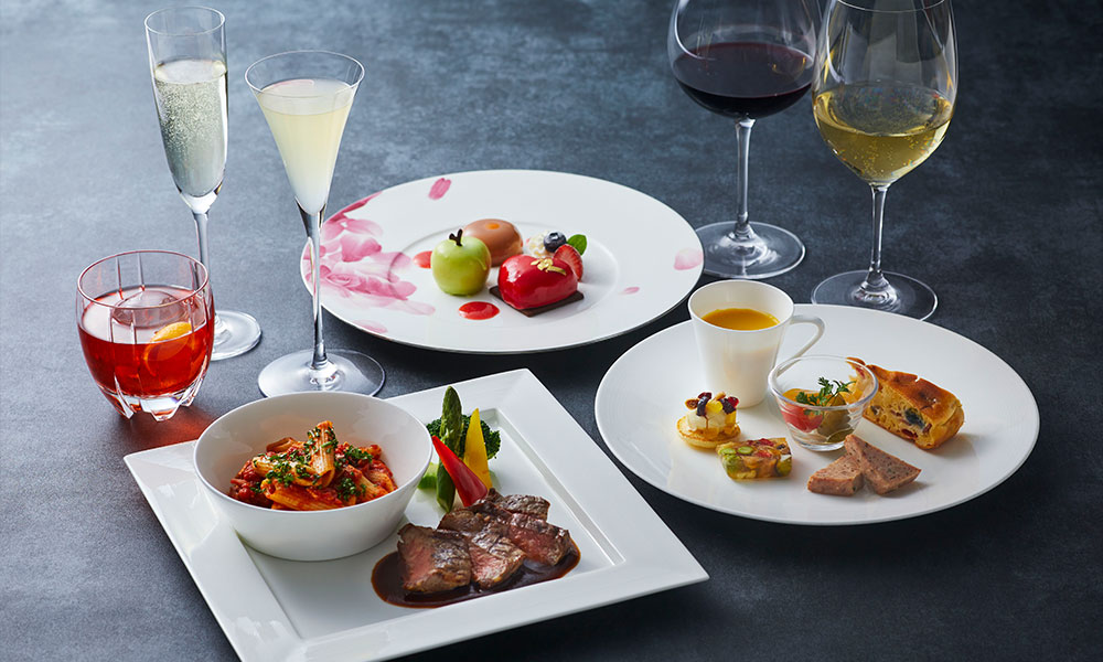 夜になると、しっとりとした雰囲気の中で、洗練されたカクテルや厳選ワイン、ホテルならではの美食を堪能できる