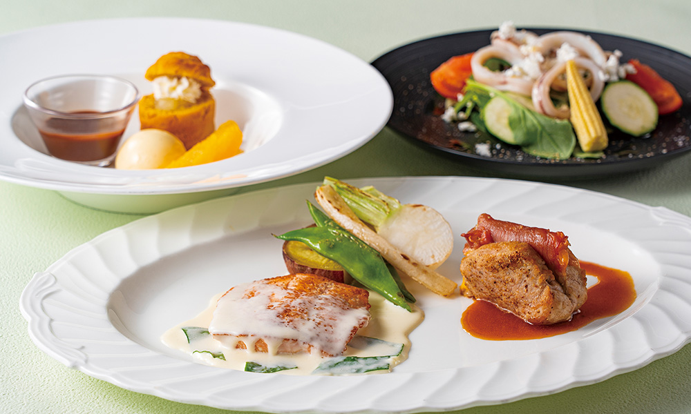 オマール海老や冬野菜を爽やかなシェリービネガーでマリネしたオードブルから始まり、京王プラザホテル伝統のコンソメスープ、白身魚のソテーをほうれん草のクリームソースが旨味を引き立たせます。メインは牛フィレ肉をロティし柔らかく仕上げ芳醇な赤ワインソースで仕上げました。デザートは濃厚なホワイトチョコのムースとさっぱりとした苺のアイス盛り合わせ。
