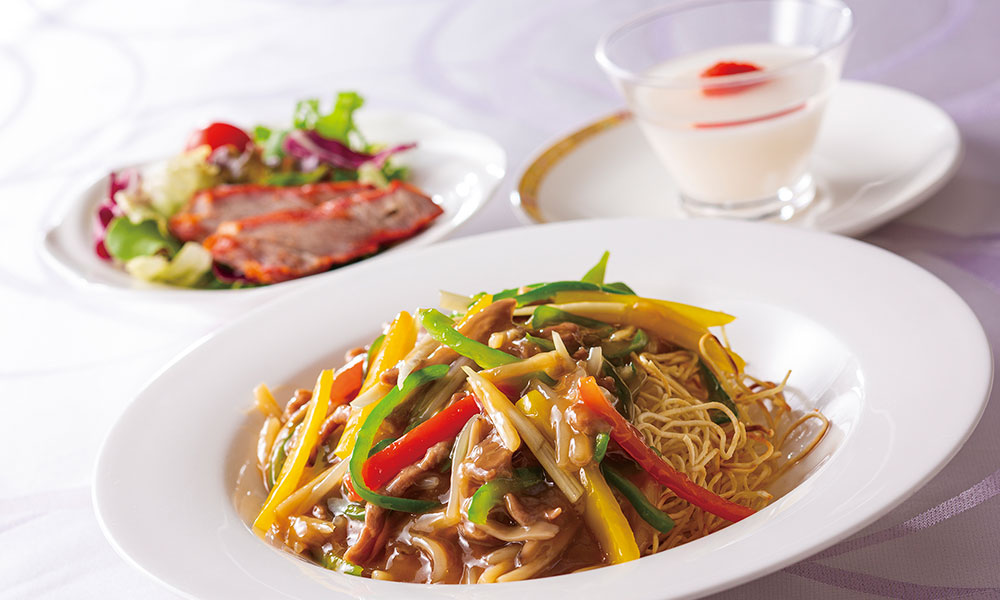 焼きそばやチャーハンに小前菜、デザートが付いたお得なランチセットです