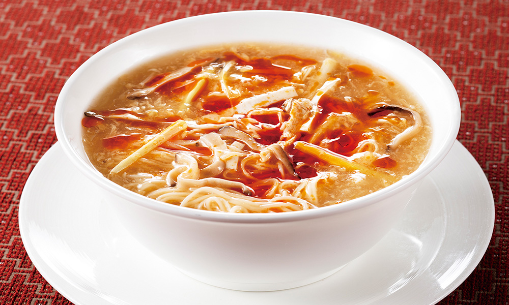 酸味と辛味が調和した極上とろみスープに極細麺が絡み合う南園特製の酸辣湯麺