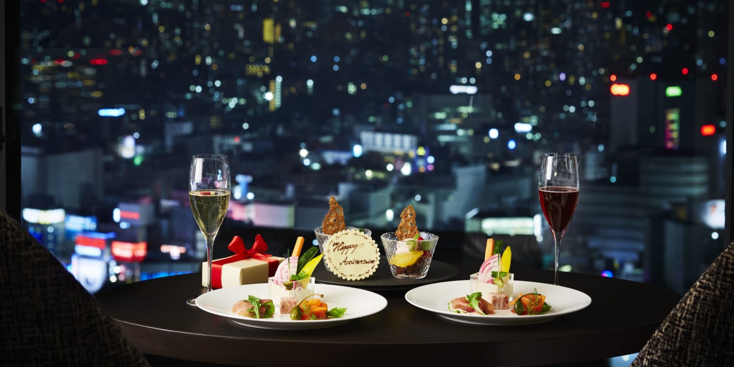 スカイラウンジ<オーロラ>のフルコースディナーとプレミアグランでのご宿泊がセットになった記念日ステイプラン。