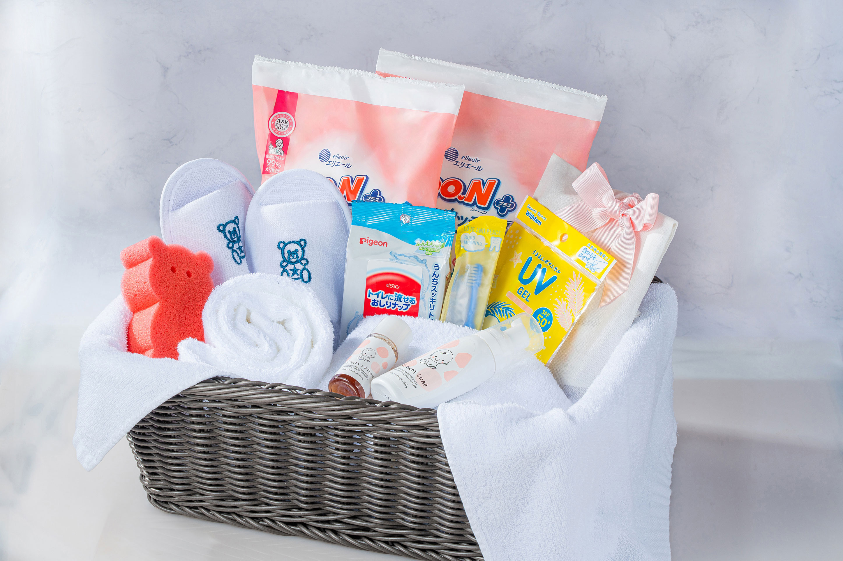 「赤ちゃん用アメニティ」「パパ・ママへのプチギフト」「赤ちゃん用お貸し出し備品」を1セットずつお部屋にご用意します。