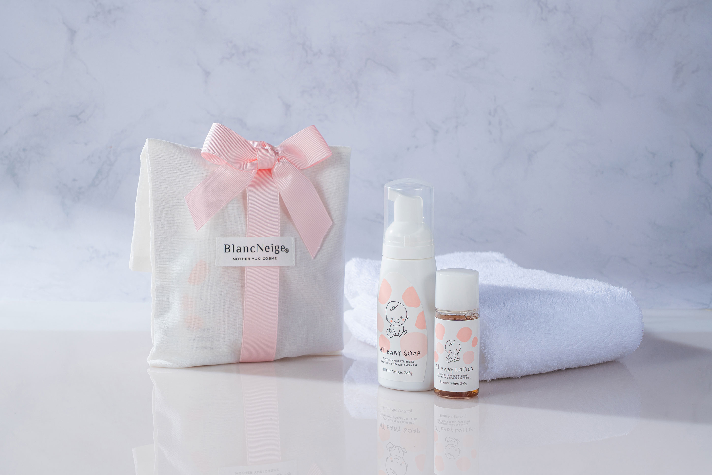 赤ちゃんの髪、全身を優しい泡で洗えるボディソープと乾燥からお肌を守る保湿剤をご用意しております。「BlancNeige(ブランネージュ)」は、無香料、無着色、アルコール無添加のスキンケアメーカーで、赤ちゃんから産後肌の状態が変化したママも家族みなさまでお使いいただけます。