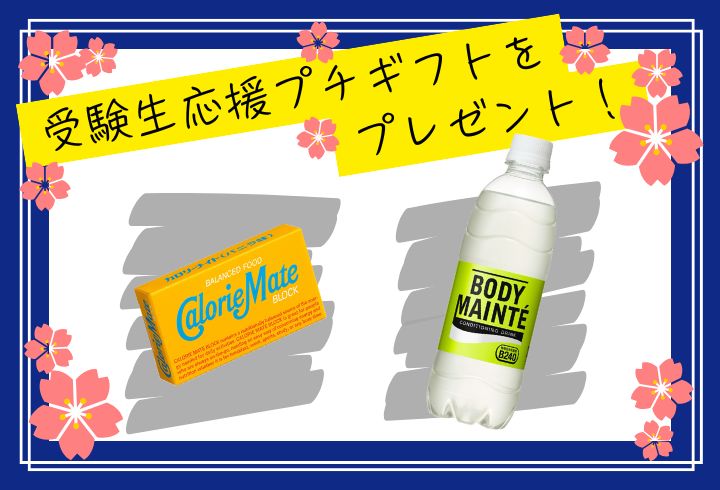 受験生への応援の気持ちを込めて、カロリーメイトとボディメンテをチェックイン時にプレゼントいたします。大事な試験前の体調管理にボディメンテを、当日の栄養補給としてカロリーメイトが支えになれば幸いです。